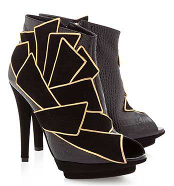 Harvey Nichols describe these as “ankle boots”. I’d call them “sandals”, personally, but whatever you want to call them, I think we can probably all agree that they’re pretty dramatic. The jagged design of the black and gold suede uppers gives these a rather “tough” look: they’re the kind of shoes that are just begging for attention, and I expect they’ll probably get it, too. The uppers and stiletto are suede, while the heel is a leather croc-print, which creates a nice mix of texture, and if you really like them, you might want to check out the ankle boot version, too:
